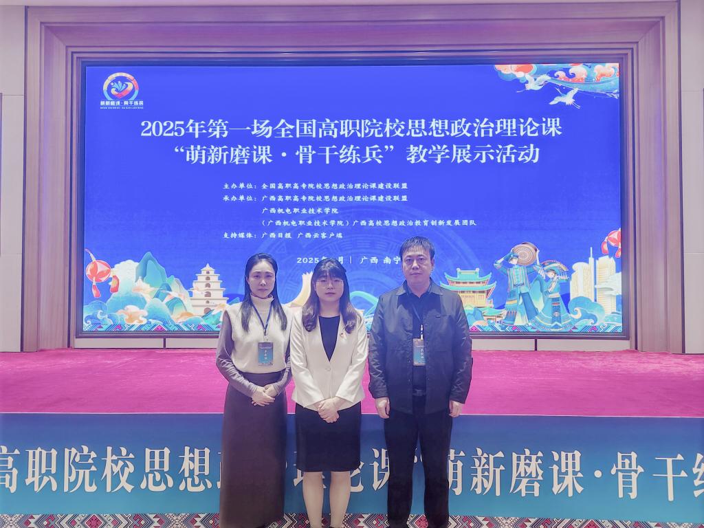 2025年3月29日,全国高职院校思想政治理论课“萌新磨课、骨干练兵”教学展示活动在广西南宁举行。我院思政课教师陈洁楠作为陕西省高职院校代表参加现场展示,并以优异表现荣获“骨干练兵”组一等奖,马克思主义学院院长许朝辉带队参赛。