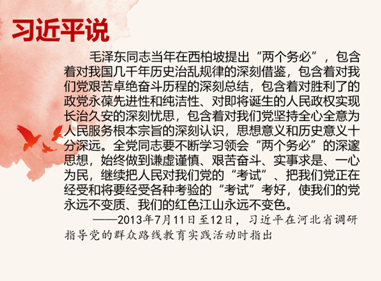 1948年5月至1949年3月,中共中央曾在地处太行山东麓的河北省平山县西柏坡办公,在这里指挥了辽沈战役、淮海战役、平津战役三大战役,召开了著名的七届二中全会,毛泽东同志向全党发出“两个务必”的号召。以“两个务必”为核心的西柏坡精神,是党和国家的宝贵精神财富。习近平同志强调,全党同志要不断学习领会“两个务必”的深邃思想,始终做到谦虚谨慎、艰苦奋斗、实事求是、一心为民,继续把人民对我们党的“考试”、把我们党正在经受和将要经受各种考验的“考试”考好,使我们的党永远不变质、我们的红色江山永远不变色。