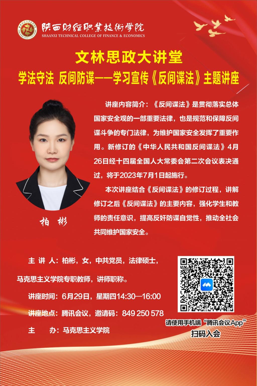 为增强广大师生国家安全观意识和法治意识,进一步提高我校师生的反间防谍意识,按照学校《关于开展<反间谍法>学习宣传活动的通知》要求,6月29日下午,我校举办《中华人民共和国反间谍法》主题讲座,由马克思主义学院柏彬主讲,全校师生通过腾讯会议参加了此次普法讲座。