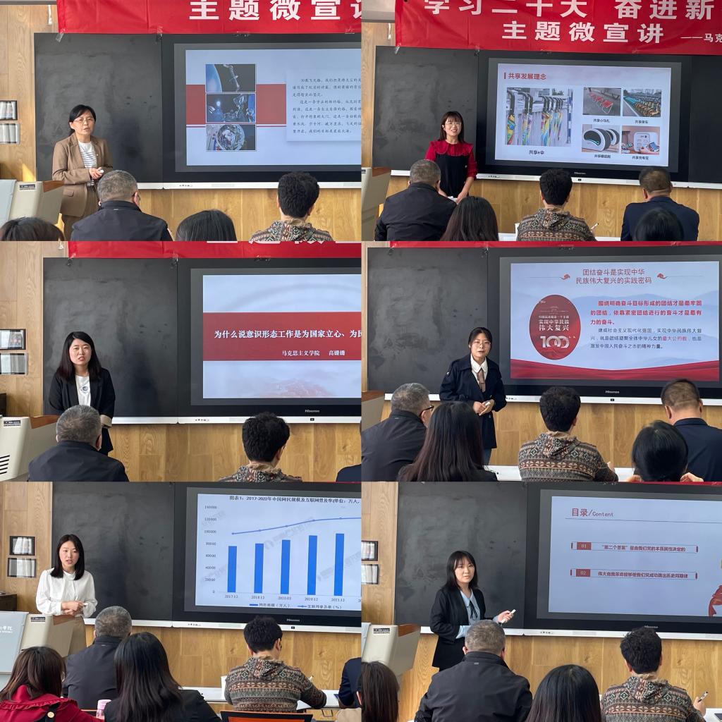此次活动经过教研室报名推荐共有6位专职思政课教师参加展示,他们用小切口呈现大主题,围绕党的二十大报告中的“团结奋斗”、“网络安全”、“意识形态”、“党的自我革命”、“科技兴国”、“共享发展理念”等内容多维度地进行了宣讲,用铿锵有力的声音讲述自己的所学所悟,时而慷慨激昂,时而娓娓道来,深入浅出地把党的二十大精神讲清楚、讲明白、讲透彻,展现了我校教师积极向上、朝气蓬勃的卓越风采。