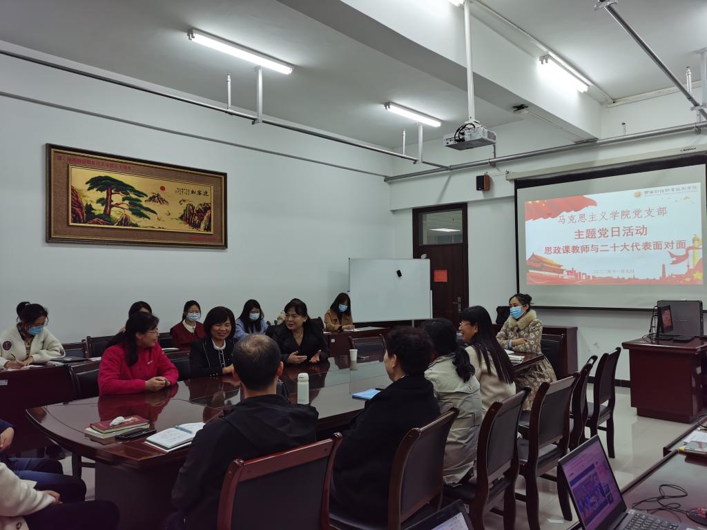 11月9日下午,马克思主义学院党支部在教学楼307会议室举办“思政课教师与党代表面对面”活动。中国共产党第二十次全国代表大会的代表、陕西省咸阳市秦都区双照街道消渡村党支部书记、村委会主任常亚琼同志受邀出席。我校党委宣传部部长严丽丽参会。马克思主义学院院长陈红梅主持,全体思政课教师参加并与常亚琼同志进行了沟通交流。