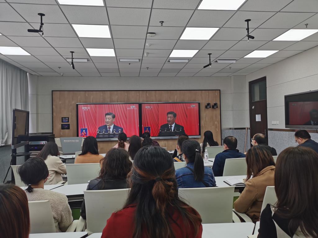 中国共产党第二十次全国代表大会于10月16日上午10时在北京人民大会堂开幕,习近平总书记代表十九届中央委员会向大会作报告。马克思主义学院组织全体教职工在教学楼718智慧教室集体收看开幕盛况,认真聆听习近平总书记代表第十九届中央委员会向大会所作的报告。学院教师们聚精会神,认真聆听,共同见证这一历史时刻,感受团结、奋进的时代脉动。