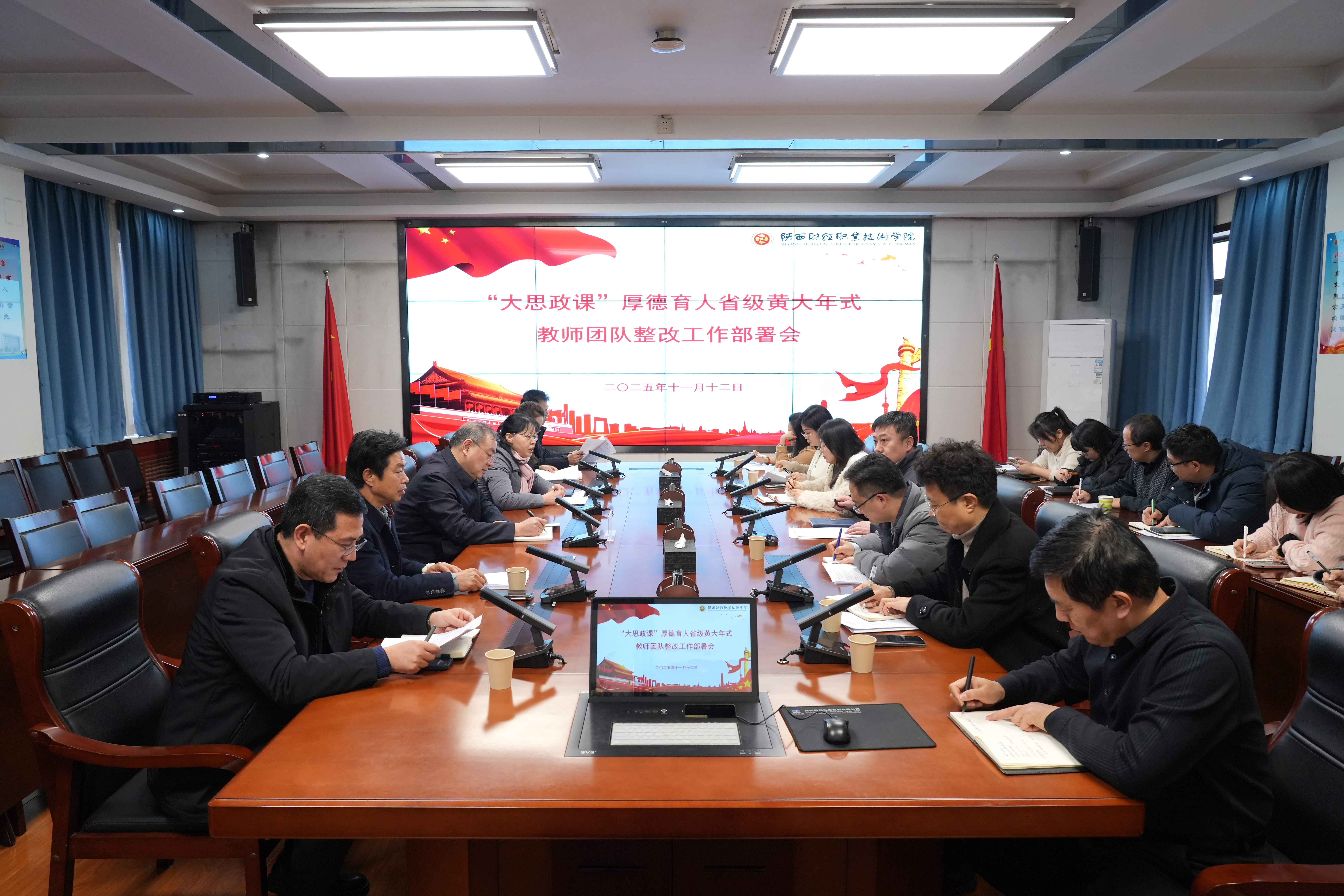 为深入贯彻落实习近平总书记关于教育、科技、人才工作的重要论述精神,大力弘扬和践行黄大年精神,促进我校黄大年式教师团队持续建设发展,2025年11月12日,“大思政课”厚德育人省级黄大年式教师团队整改工作部署会在办公楼四楼会议室召开。团队全体成员及学校教务处、人事处和财务处等职能部门负责人参会,共同为团队整改提升凝心聚力、谋划蓝图。
