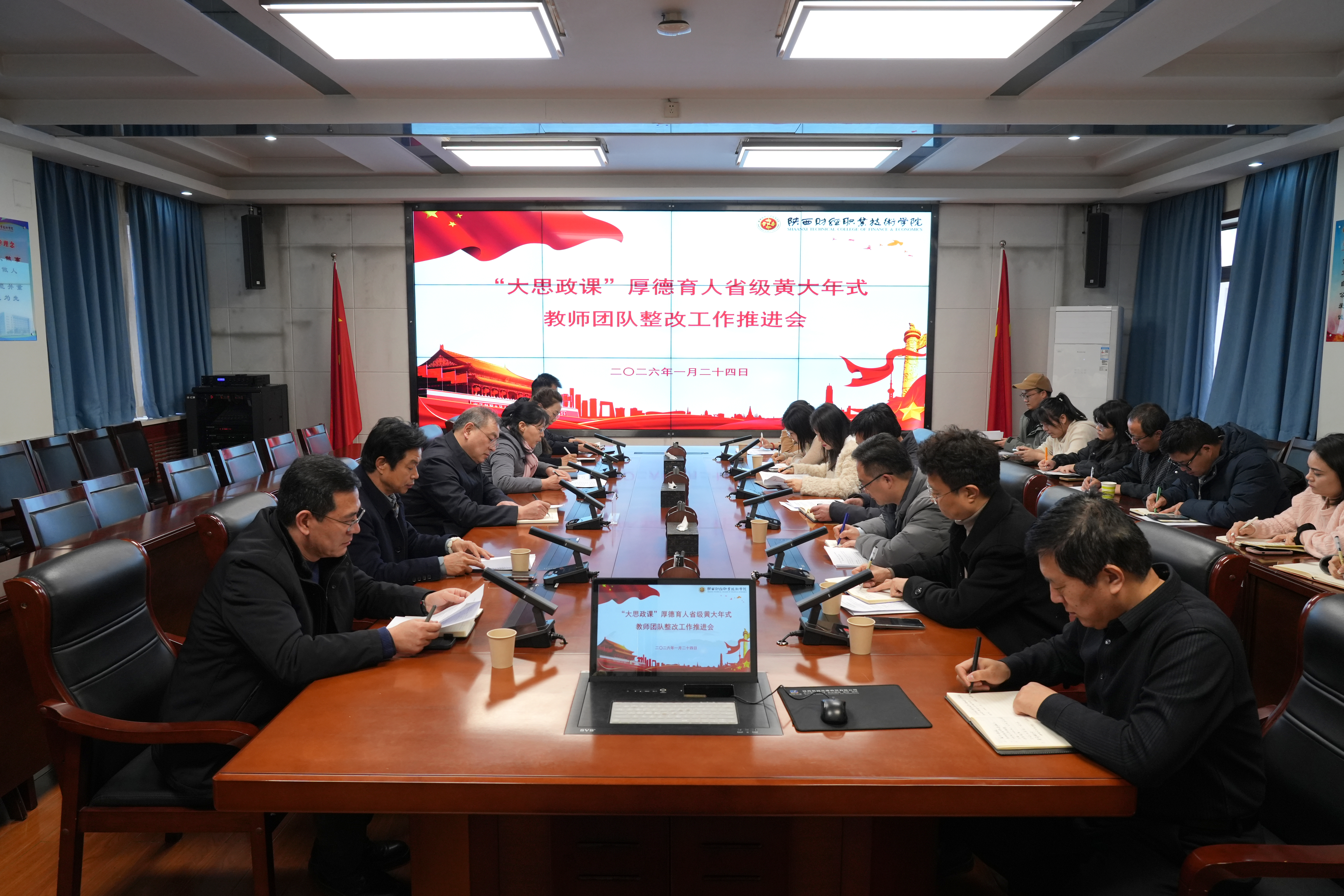 为深入贯彻落实《陕西财经职业技术学院“大思政课”厚德育人黄大年式教师团队整改方案》,扎实推进团队高质量、内涵式发展。2026年1月24日,我校黄大年式教师团队整改工作推进会在办公楼四楼会议室召开,团队整改工作领导小组组长、校长程书强主持会议并作工作部署,整改工作领导小组全体成员、整改工作办公室成员及团队全体成员参加会议。